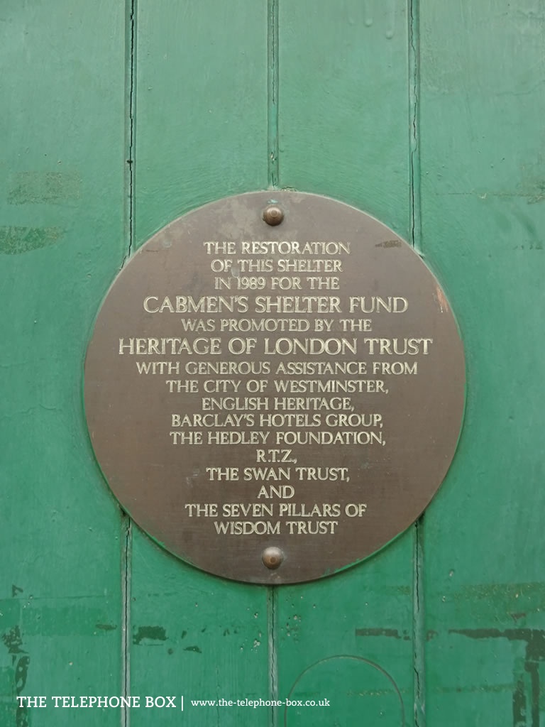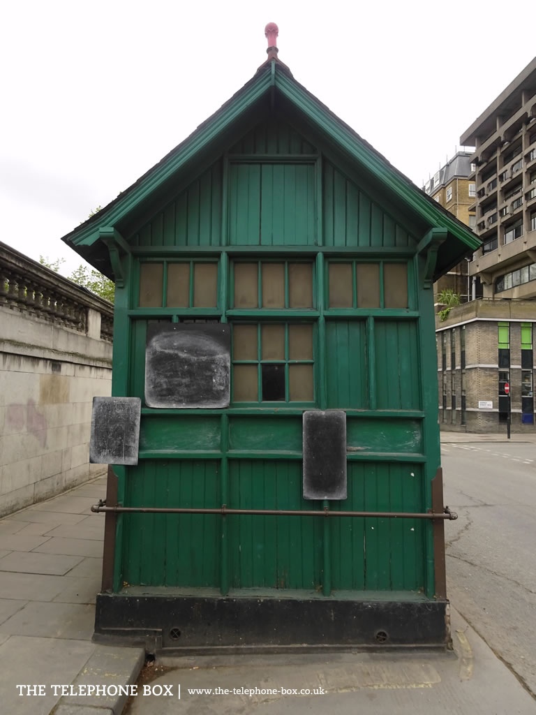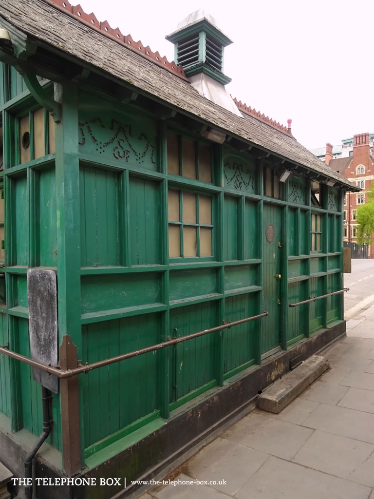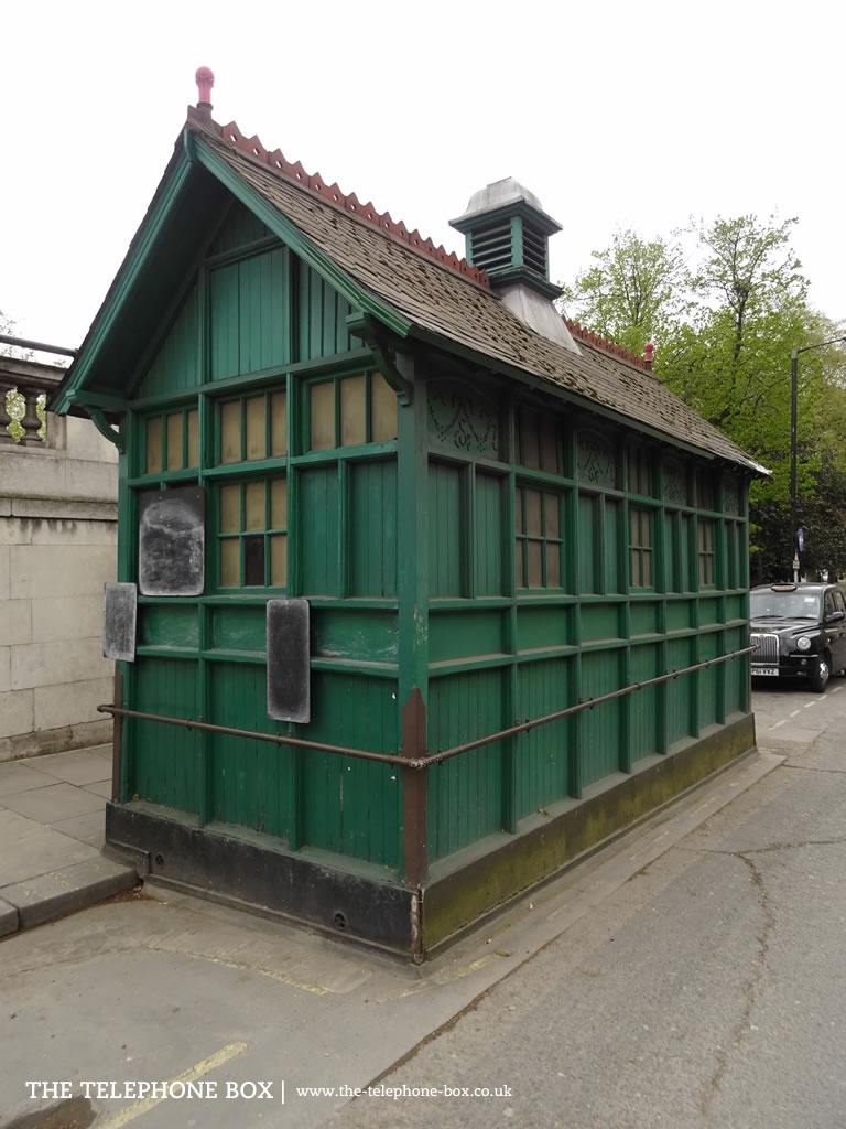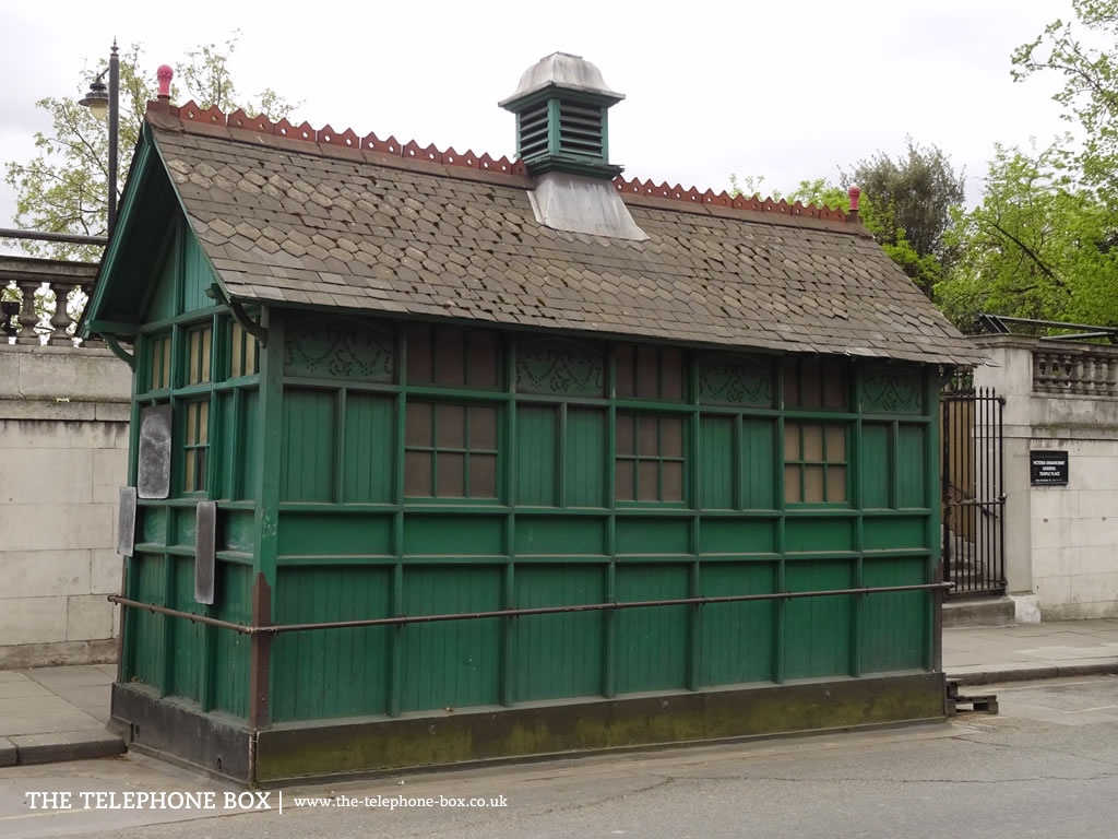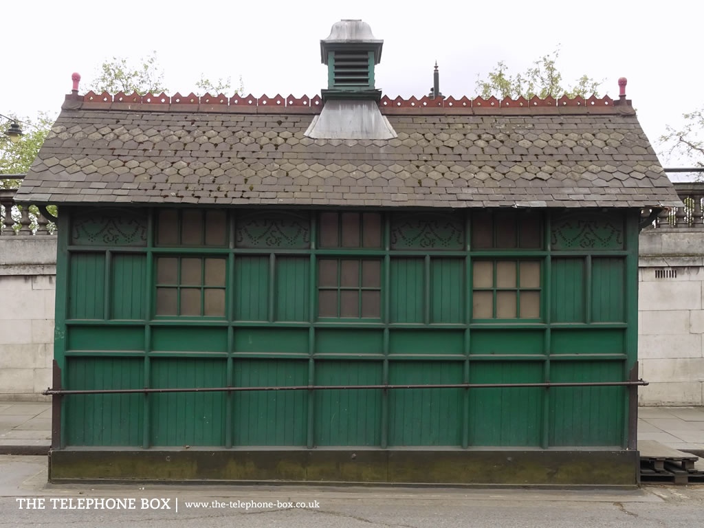 Between 1875 and 1914 just 61 examples of the cabmen's shelter were installed. Built of timber, they were only intended as temporary structures. Remarkably then, over a century later, thirteen examples have survvived (about 21% of all London's shelters). There are other regional examples of similar structures, notably in Ripon (North Yorkshire) and Hitchin (Hertfordshire). All of London's survivng cabmen's shelters are Grade II-listed. The example illustrated, located behind Temple Underground Station, was listed on 1 December 1987.Notes