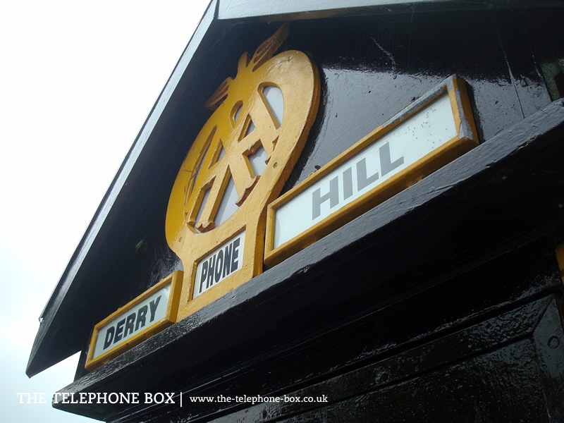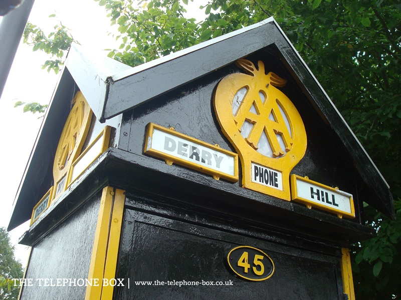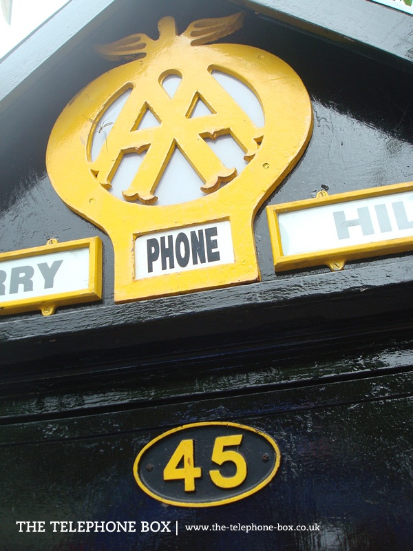 The 1927 Sentry Box is of timber construction, and the main body of the box tapers outwards towards the base. The body is finished in black gloss paint. The vertical edges of each side and edges to the door are marked with strips of wood, painted in AA yellow. The door carries a large 'winged' AA logo with an oval cast-iron number plate above, whilst on the remaining signs are cast-iron number plates, with the edges of the sign and the number picked out in yellow. The right-hand side of the box carries the telephone equipment and external bells. There is a thin, projecting architrave above the main body of the box. Above, the roof is formed of gables on each side, forming a cross-gable roof when viewed from above. The zinc-metal plated roof projects from the gable ends and is faced with black-painted wooden eaves. The roof is topped with a finial, which provides the box with ventilation. Each gable end carries a large 'winged' AA logo, the base of which is pierced by a rectangular sign, with the word 'Phone' spelt in san-serif lettering. Either side of the logo, at the base, are two further yellow-edged signage plates, spelling out the location of the sentry box.