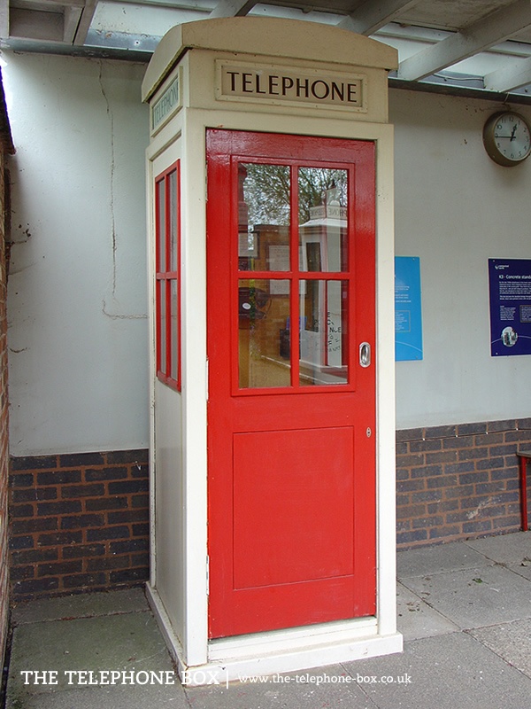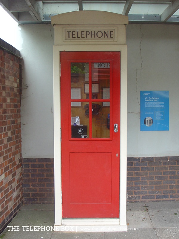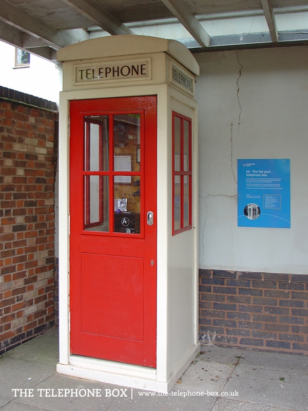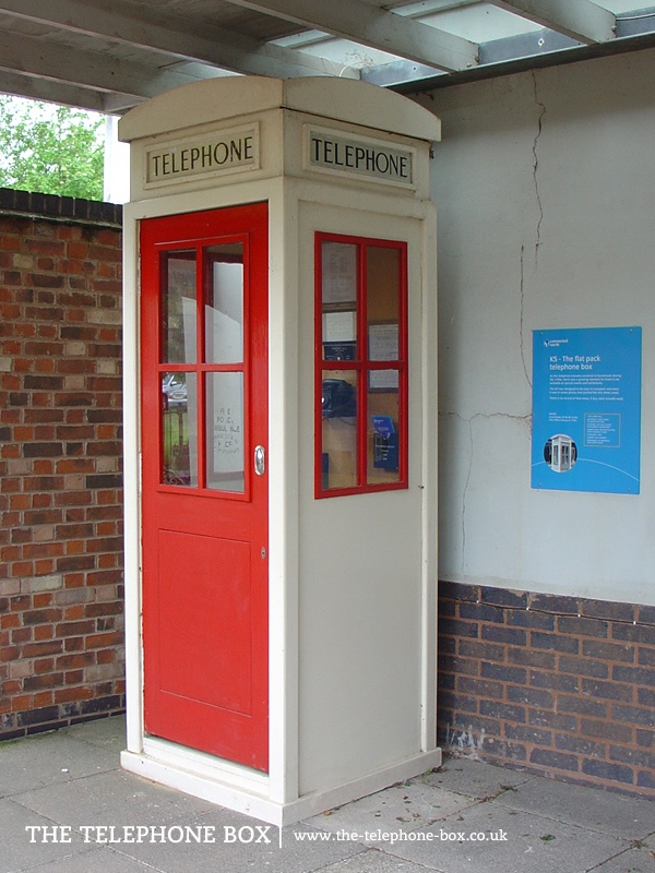 The K5 kiosk is constructed of pre-manufactured sections, bolted together. Prototype sample kiosks were manufactured of plywood (possibly steel-faced for durability), and it is possible final production would have been in concrete. In its general form the K5 is a four-sided rectangular box with a domed roof. There are column posts at each corner, with the four sides of the kiosk set back from the edge of the columns. Windows are set into three of the four sides of the kiosk, comprising two rows of two rectangular glass panes. The window moldings are picked out in red, as is the door which features two rectangular panels with reeded moldings below the windows. The back panel of the K5 is blank. The K5 most likely would have been painted white or a cream colour. Above the main body of the kiosk is a plain entablature. The entablature carries a rectangular slot for signage, with reeded molding. Set into the slot is an illuminated telephone sign, with serif capital lettering on opaque glass. The roof of the kiosk is domed, formed by plain, segmental pediments. The K5 is unlike many of the General Post Office kiosks as it has no detailing and the pediments carry no Royal crown.