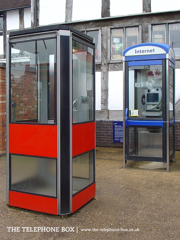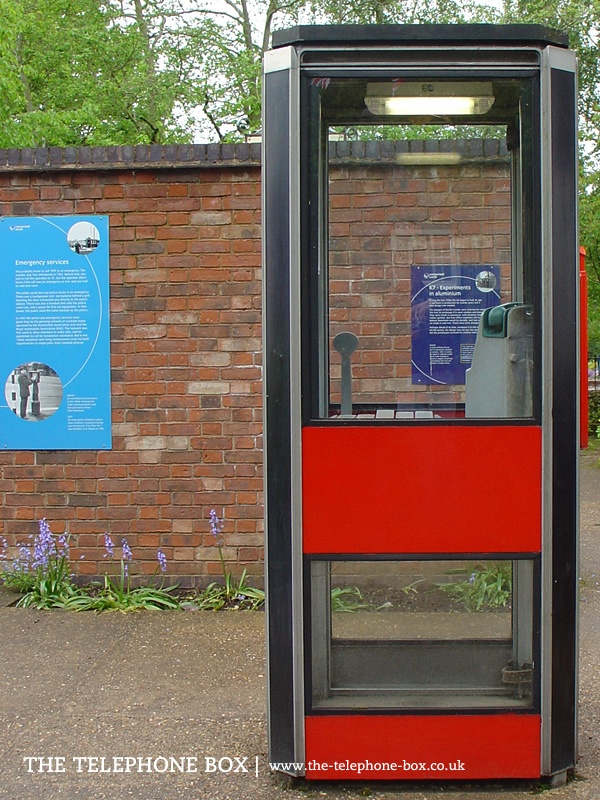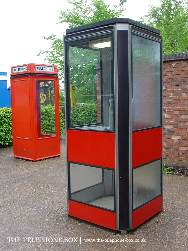The K7 kiosk is constructed of aluminium (although the General Post Office produced six examples in cast-iron) standing on a narrow concrete base; the kiosk stands wider than the concrete base so that the kiosk 'floats' above the ground. Its general form is a four-sided rectangular box with a flat roof. The corners of the kiosk are chamfered, with narrow panels at a 45 degree angle to the main faces of the kiosk. These narrow panels are structural sections of aluminium with plastic cladding. All sides of kiosk are glazed, with modesty panels at waist height and a slim panel at the base of each side. These panels are red in colour. The glazing is held in place with rubber gaskets, in a similar way to modern car windscreens. One glazed side of the kiosk uses frosted glass, to improve the privacy of users. The door is identical in appearance to the other sides, with a 'column'-shaped handle on the outside and a 'pad' handle on the inside. Without a solid back panel (as with earlier kiosks) the telephone equipment is attached to the inside of one of the chamfered corners. Aside the telephone is a racking system for telephone directories. There is no external 'Telephone' signage, nor is there a Royal crown.